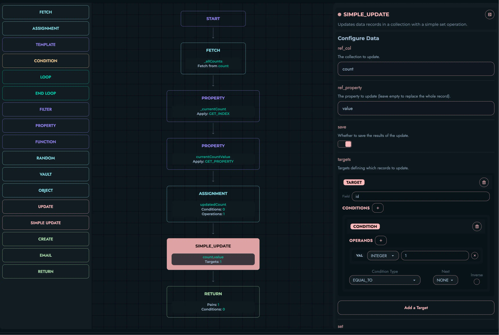 The X Engine is the defining feature of Kinesis API. Design complex API workflows using a block-based visual editor — add blocks from the sidebar, select one to open its configuration panel on the right, and your logic executes top to bottom in a clear, predictable sequence.